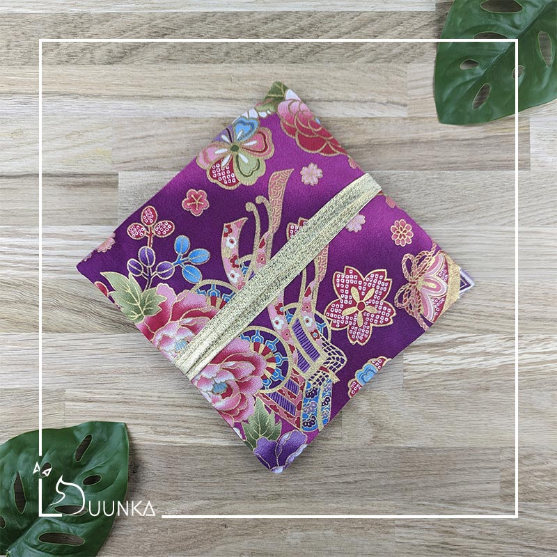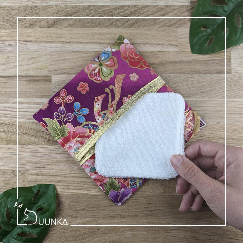 Le côté déco est en authentique tissu japonais. Le coté démaquillant est en micro éponge coton et bambou certifié Oeko-Tex (garantit l’absence de substances nocives pour la santé).