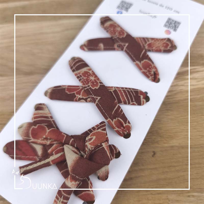 Je travaille avec de belles matières : de l’authentique tissu Japonais (directement importé du Japon) et de la suédine douce au toucher. Le passepoil doré et le pompon bohème font eux aussi partie de ma marque de fabrique.