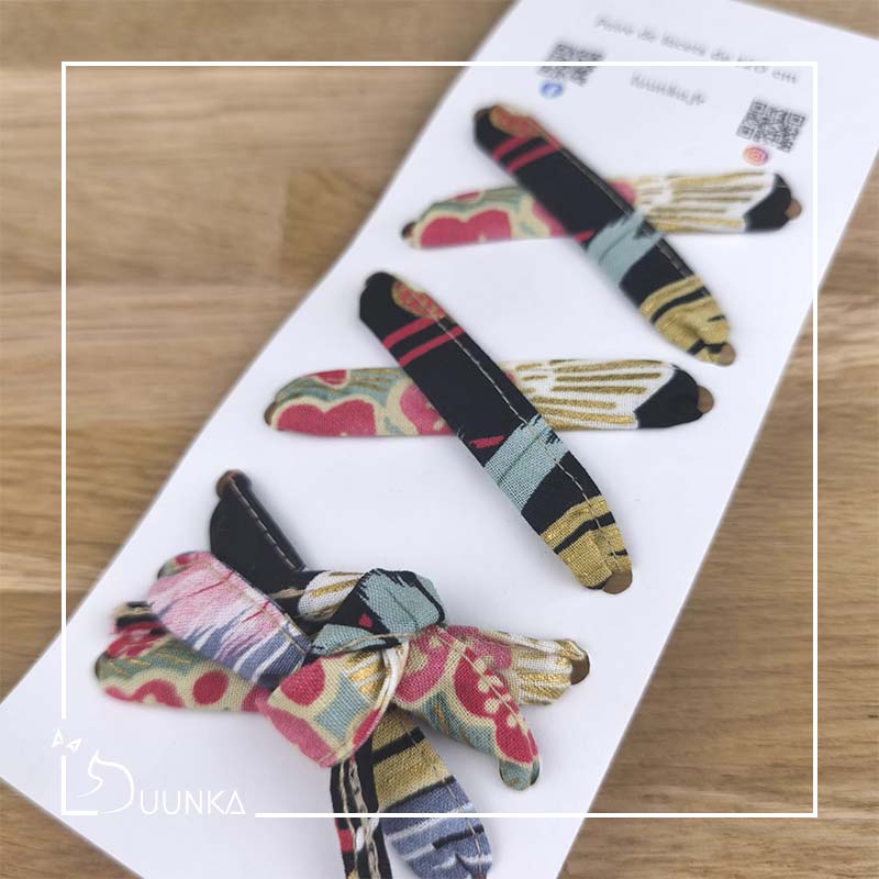 Je travaille avec de belles matières : de l’authentique tissu Japonais (directement importé du Japon) et de la suédine douce au toucher. Le passepoil doré et le pompon bohème font eux aussi partie de ma marque de fabrique.
