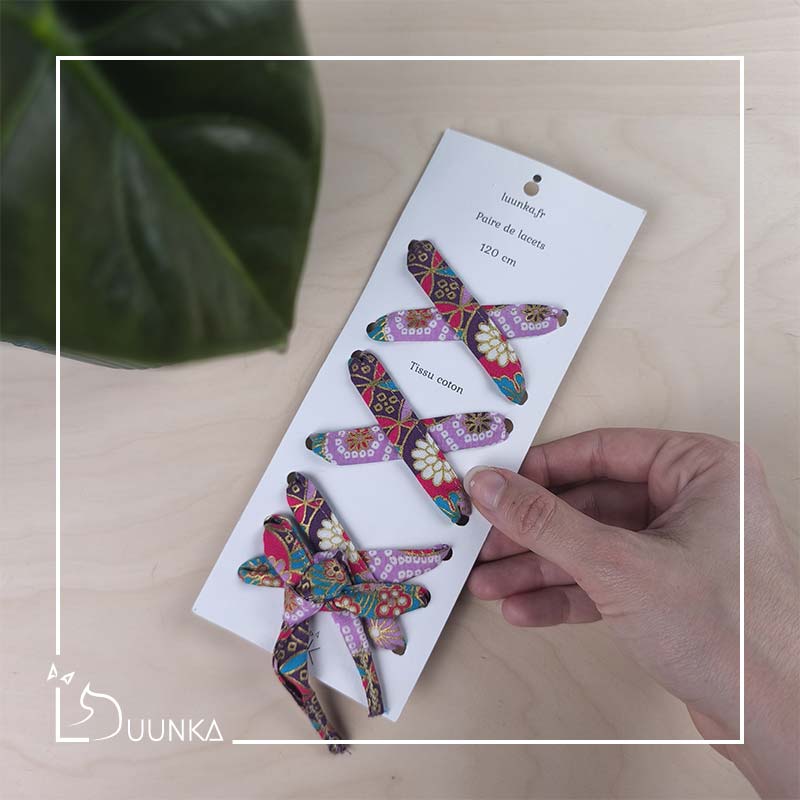 Cette paire de lacets convient aux chaussures à 12 œillets (6 trous de chaque côté). Les lacets sont plats et plus larges que la moyenne : ainsi les motifs du tissu japonais sont visibles de loin. Comme ils sont larges, préférez les lacer sur des chaussures avec des œillets.