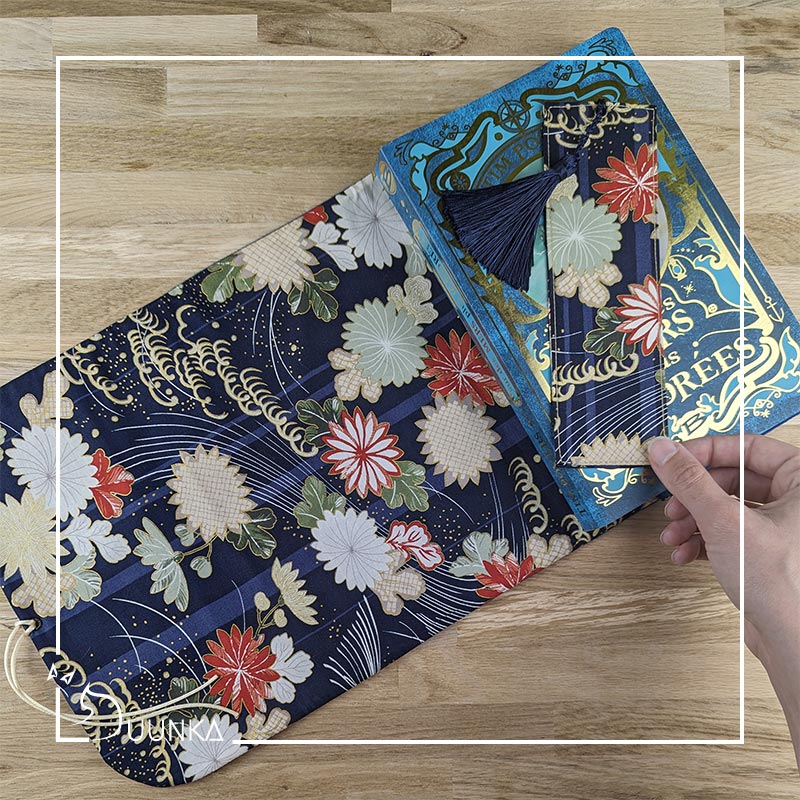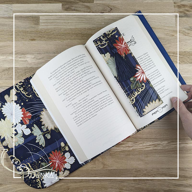 Cette pochette livre et ce marque page sont des pièces uniques de créatrice. Je les ai découpés et assemblés dans mon atelier situé au sud de Toulouse.
