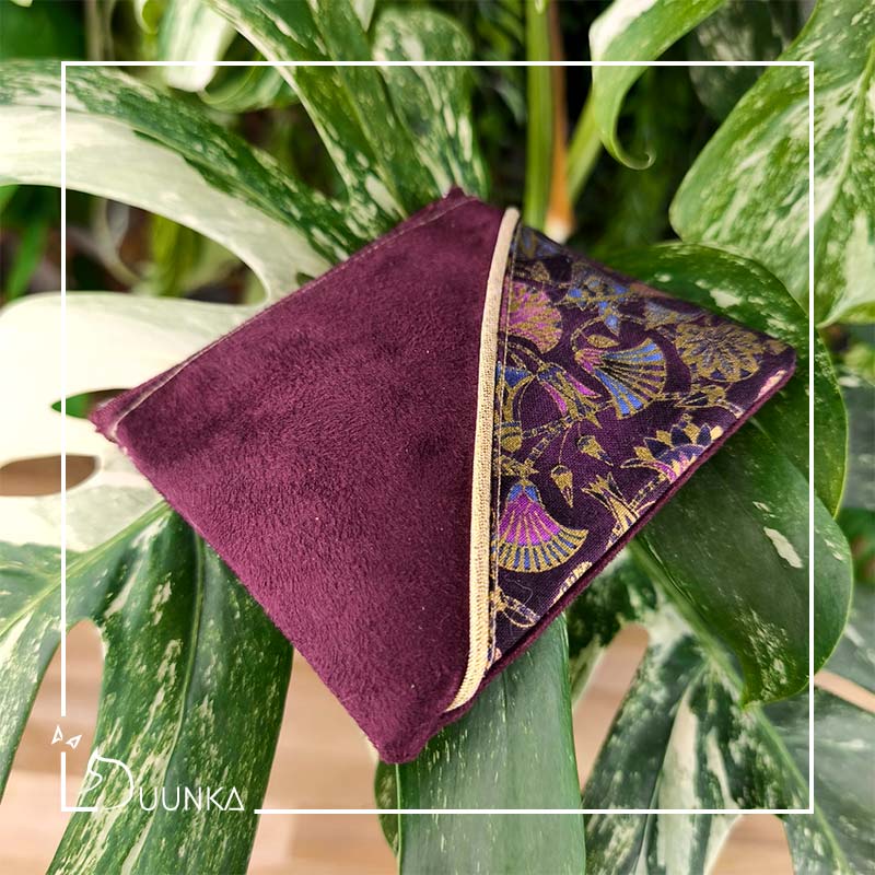Il est en authentique tissu japonais et en suédine douce au toucher. Il se ferme avec un zip de 10 cm.