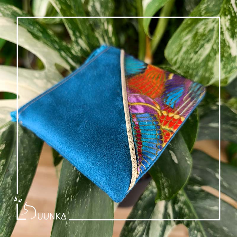 Il est en authentique tissu japonais et en suédine douce au toucher. Il se ferme avec un zip de 10 cm.