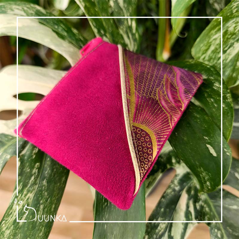 Il est en authentique tissu japonais et en suédine douce au toucher. Il se ferme avec un zip de 10 cm.