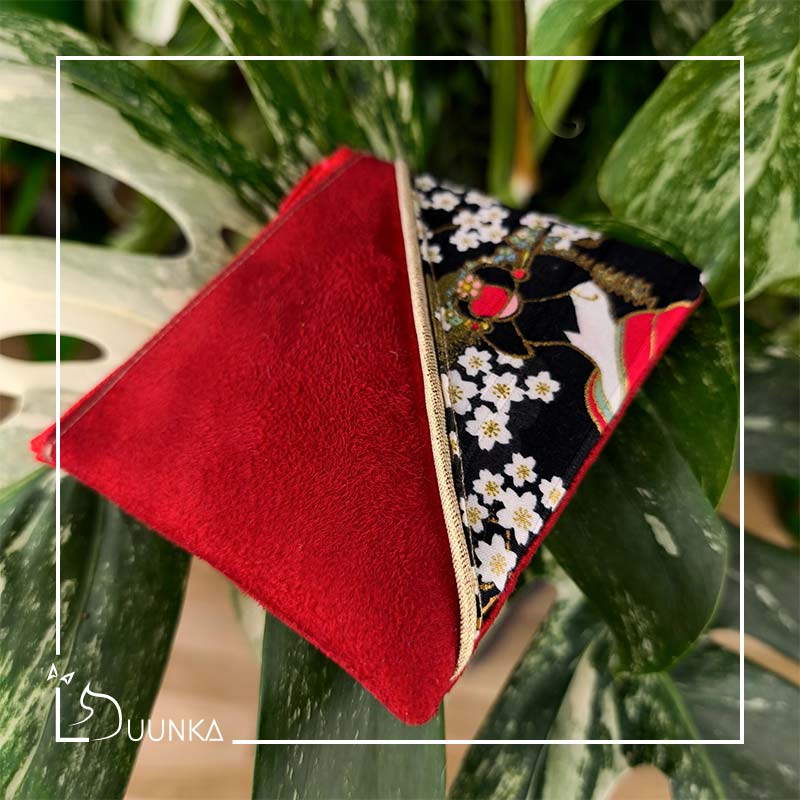 Il est en authentique tissu japonais et en suédine douce au toucher. Il se ferme avec un zip de 10 cm.