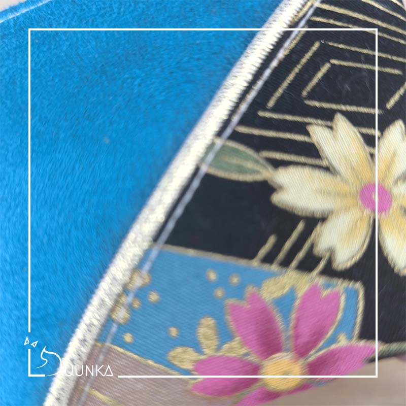 Je travaille avec de belles matières : de l’authentique tissu Japonais (directement importé du Japon) et de la suédine douce au toucher. Le passepoil doré et le pompon bohème font eux aussi partie de ma marque de fabrique.
