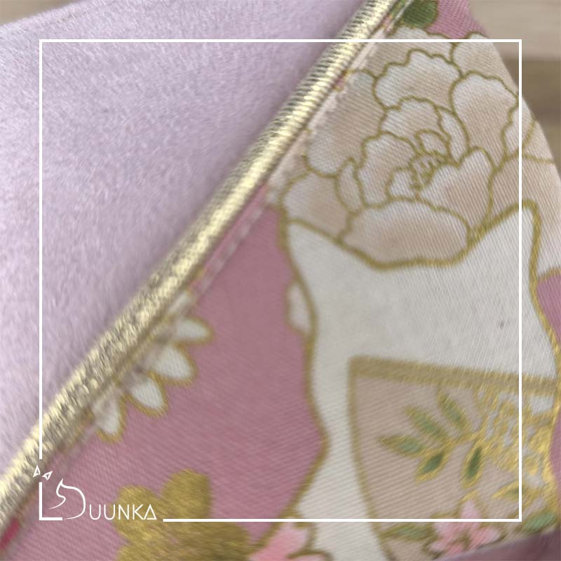 Je travaille avec de belles matières : de l’authentique tissu Japonais (directement importé du Japon) et de la suédine douce au toucher. Le passepoil doré et le pompon bohème font eux aussi partie de ma marque de fabrique.