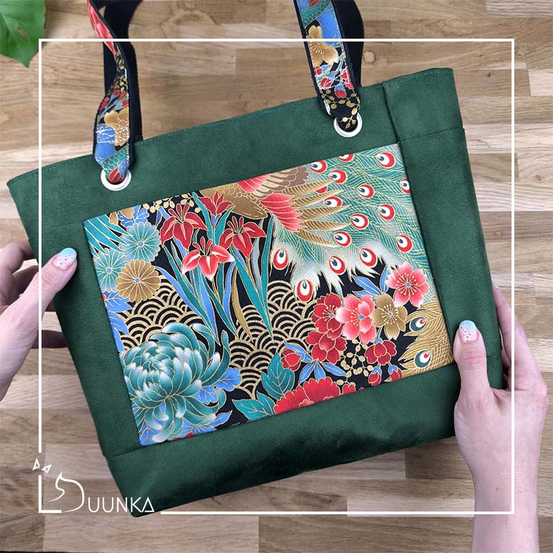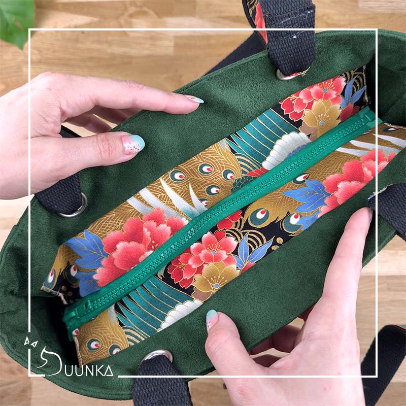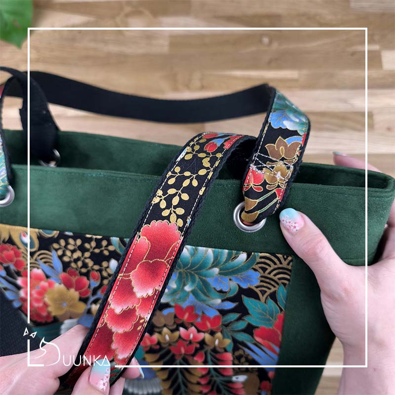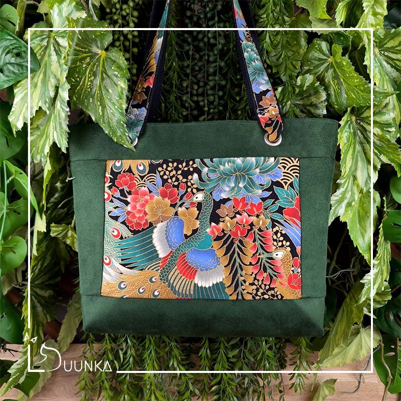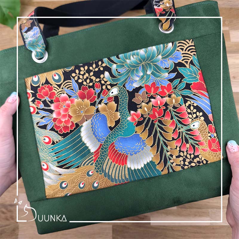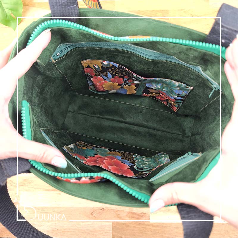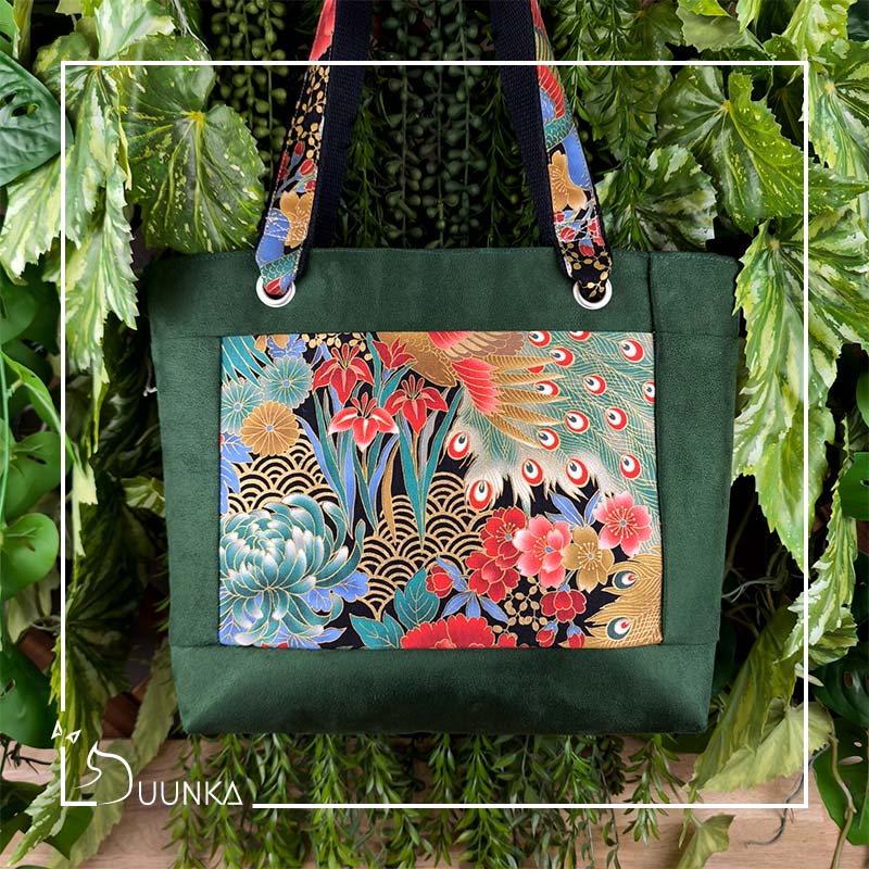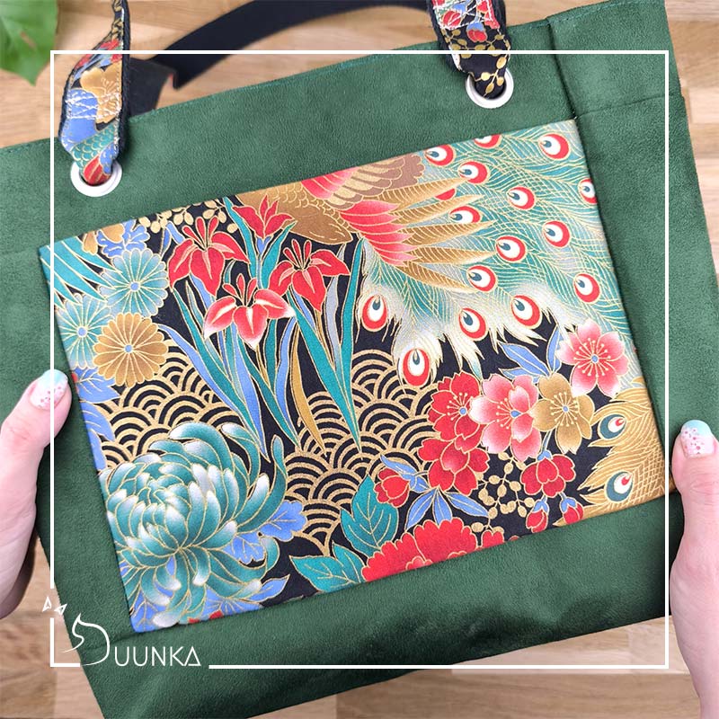 Il est en authentique tissu japonais et en suédine douce au toucher. L’intérieur est doublé (en suédine). Ce sac cabas est également renforcé pour garder son maintien. Pour l’effet waouh les anses sont réalisées avec le même tissu japonais qu’à l’extérieur. Il se ferme avec un zip de 30 cm.
